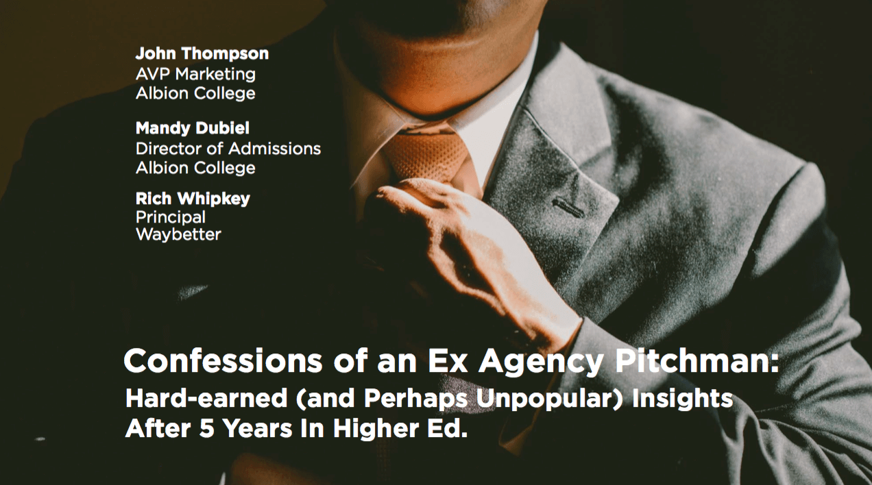 So if you find yourself hoping to mix in some actual enrollment marketing talk along with the more heady brand stuff, we’d encourage you to swing by our session on Monday at 11:15 a.m. It’s called “Confessions of an Ex Agency Pitchman,” and it’ll be led by John Thompson, VP for Marketing at Albion College. He’s got a pretty unique take on all things higher ed after leaving the creative/branding world to spearhead an integrated marketing effort at a tuition-dependent institution.