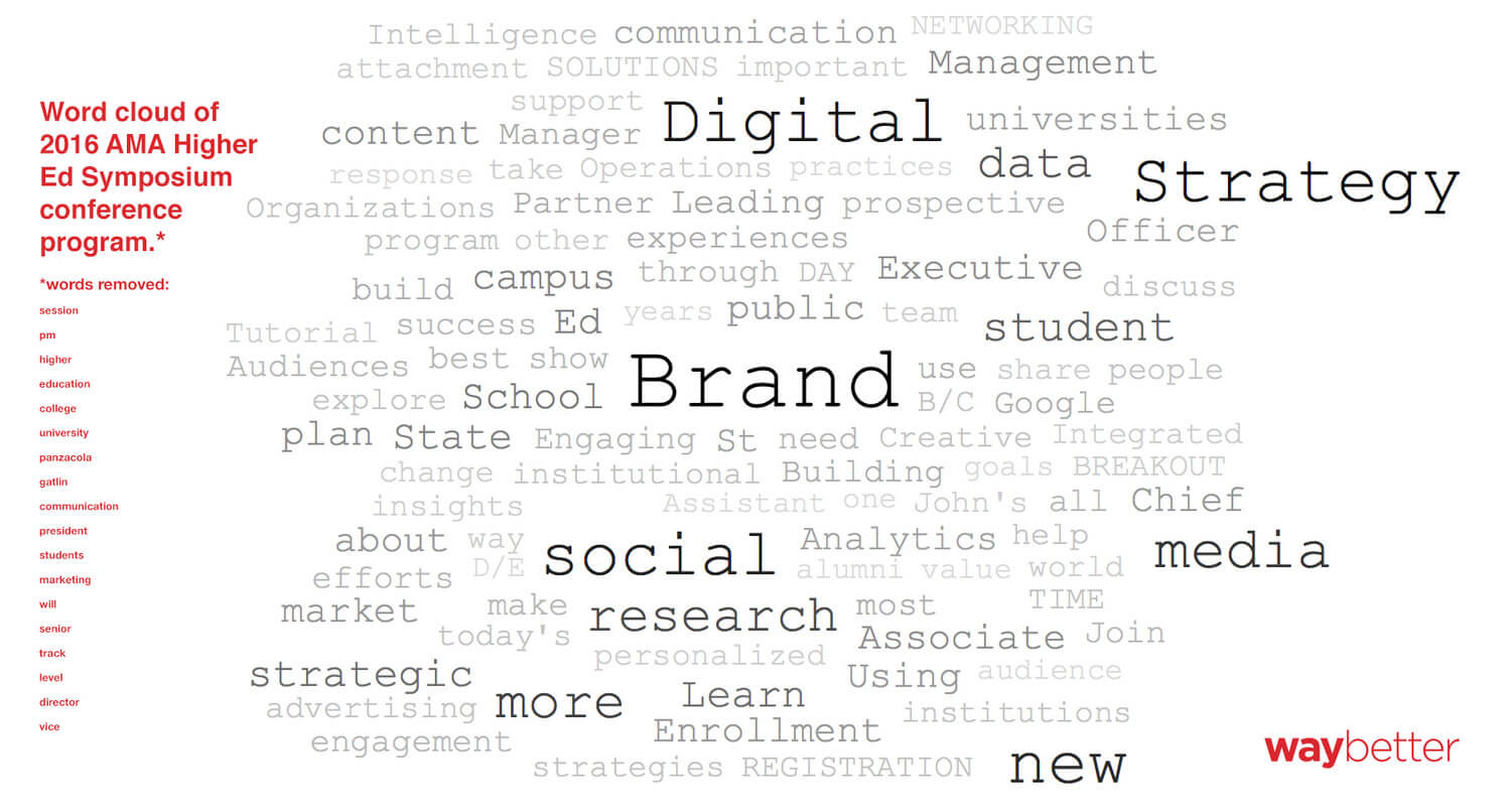 This isn’t a knock on the conference or any of its wonderful presenters or exhibitors, but the data does bear out that this particular conference leans more toward the branding/social media/creative side of marketing than it does the nuts-and-bolts/butts-in-seats marketing that’s Waybetter’s bread and butter. In fact, here’s a quick word cloud visualization of this year’s conference program (with a few words pulled out, like names of conference rooms or words that appear mostly in job titles…click to enlarge).
