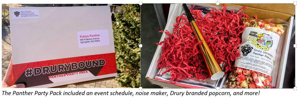 WARNING: This is not your average virtual information session. Drury brought the energy and excitement from day one by creating a welcoming promotional video, followed by a Panther Party Pack sent out 1-2 weeks ahead of the event. To close, they hosted the ULTIMATE Panther Party, complete with noisemakers, a virtual photo booth, and giveaways. They even sent a Panther bobblehead to all attendees as a thank you gift.