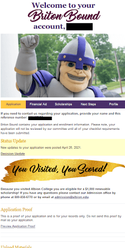 - Financial Aid: It can be a tricky thing for a student to navigate, so be as transparent as you can. Don’t hide the merit scholarship in your acceptance letter – prominently display it on the portal to create excitement and engagement.