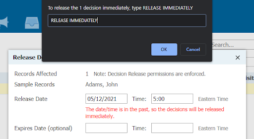- Give yourself buffer time between confirming and releasing the decision. The first step is to confirm your decision, which you can do immediately, but we recommend setting your release date at least a few hours into the future. This gives you time to stop release if needed by un-releasing the decision before students are notified.