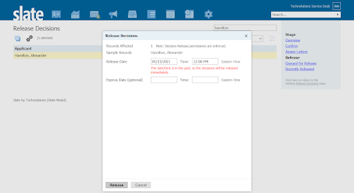 As mentioned before, Slate has a great Decision Release module that acts as a one-stop shop for the actual release of decisions. In this module, you must progress through the stages in sequential order (Confirm, Assign, Release), and Slate lays it all out for you with several warnings and opportunities to explicitly confirm your actions (as seen below). A few things to consider: