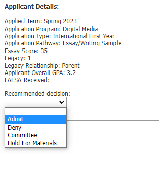 Slow and steady wins the race. However, in peak reading season, admissions staff could have reader queues a few hundred applications deep, and a deadline to clear them by COB. This is where mistakes could happen. To prevent a student from being moved to the Admit bin when they should really be held for grades (or perhaps flat-out denied), ensure that all readers who can recommend a decision have to select that recommended decision from a list, rather than simply moving the application into the “Admit” or “Deny” bin. This will come in handy later on for comparing recommended decisions to the actual decision you are about to apply to the student’s record.